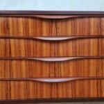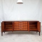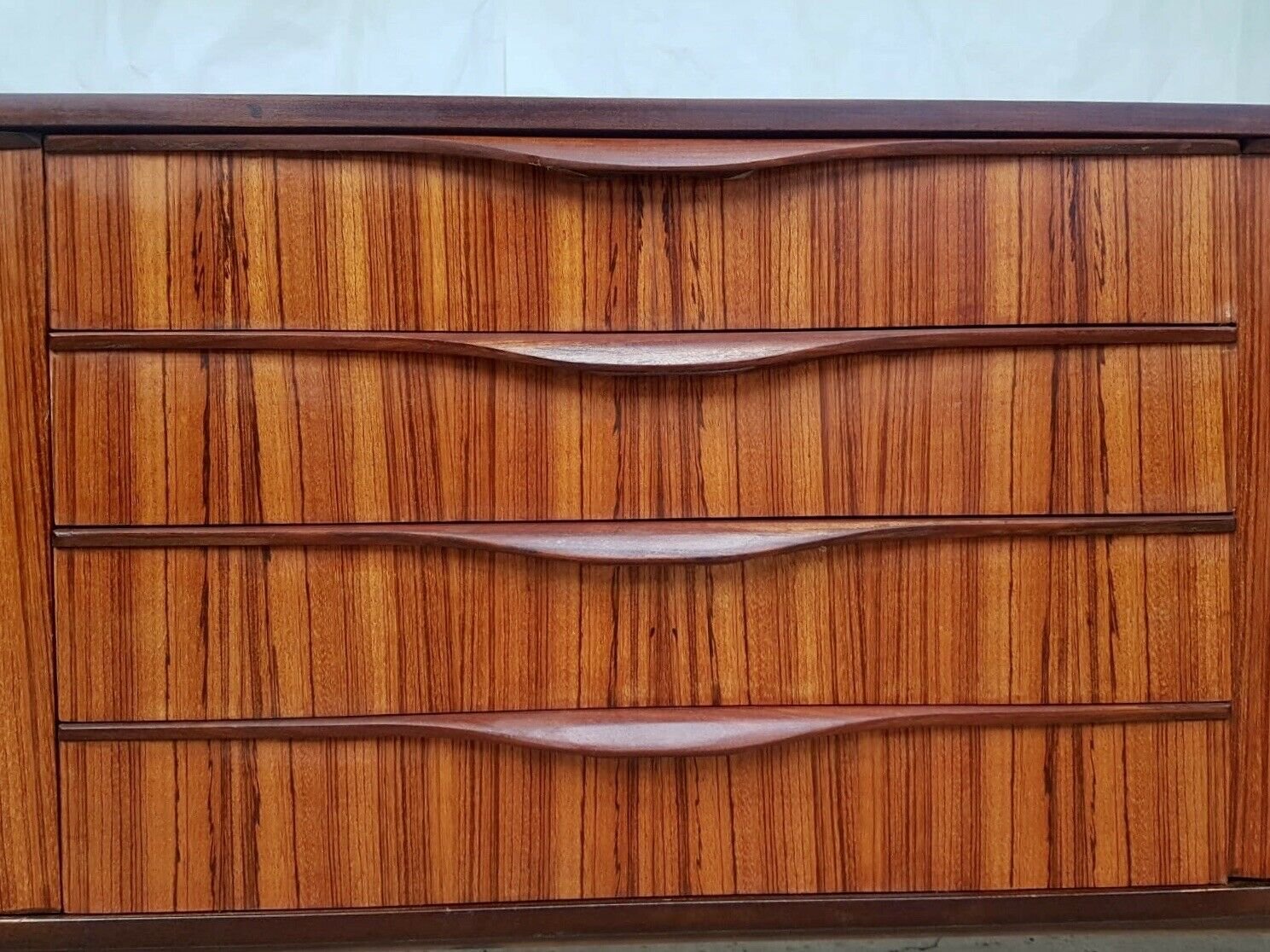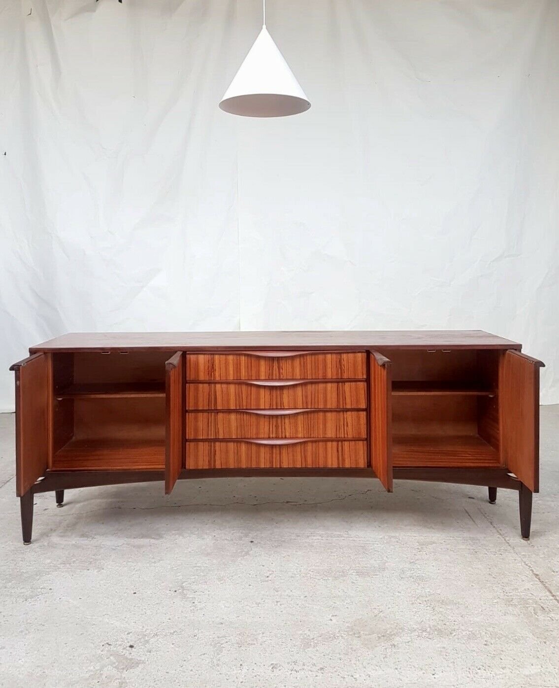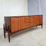 This rare 1960s sideboard is of incredible quality and design. Expertly crafted by Elliots of Newbury and made from the highest quality Zebrano teak & Comprises a middle bank of 4 drawers and cupboards either side. Spectacular grain throughout, stunning handles and a unique base and rocket styled legs.