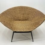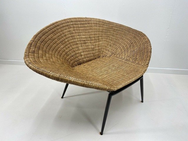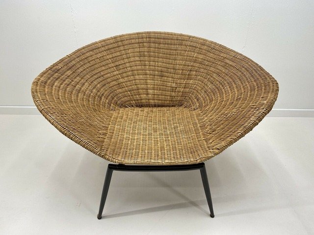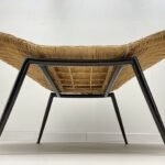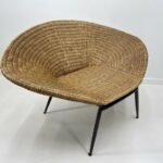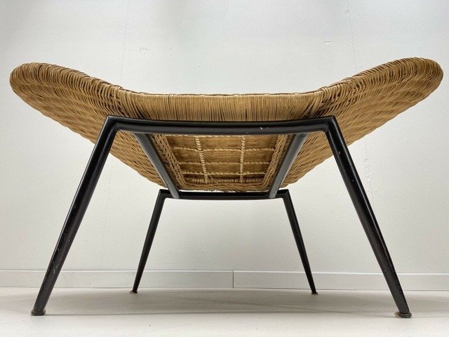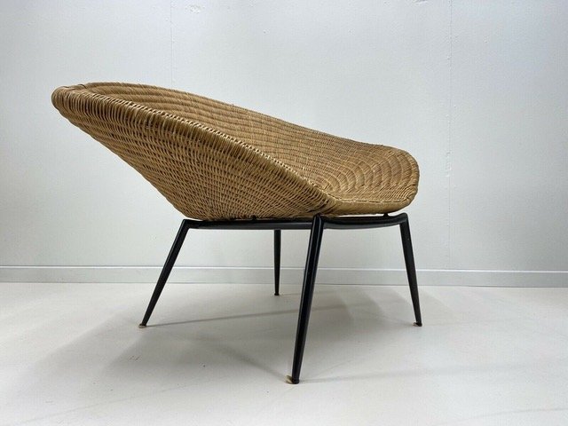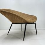 Beautiful Large Sleek 1960 Shell Shaped wicker armchair with bold black curved metal frame and fine tapered legs.