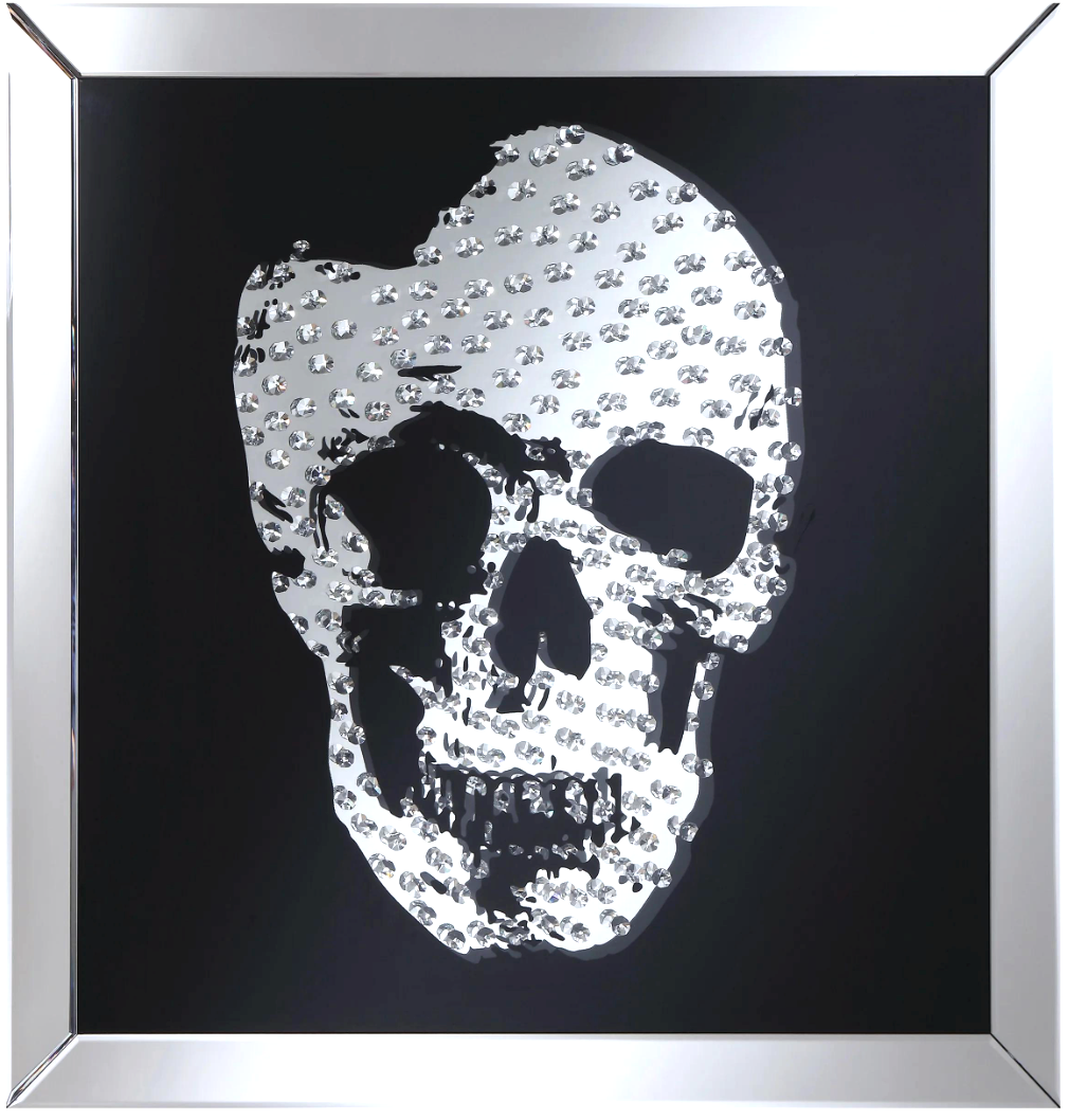 This Crystal Skull wall mirror is sure to be the focal point of any room. Dramatically cast with a skull shaped mirror that is the perfect contrast against a black background. Faceted optic glass crystals adorn the skill layering it with added luxe and brilliance. To complete the look, a beveled mirrored border frames the piece creating an intricate play of light and refection.