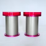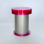 The brightly colored round seat, reminiscent of crystallized confectionery, floats atop a substantial silver cylindrical base that provides both structural integrity and aesthetic contrast. This intentional juxtaposition of materials—the delicate, translucent resin against the industrial permanence of polished metal—speaks to Lall’s signature exploration of opposing elements.